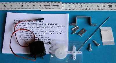 Stelldrahts am Servofinger, Haltebügel, Klebepad und Schrauben bei.